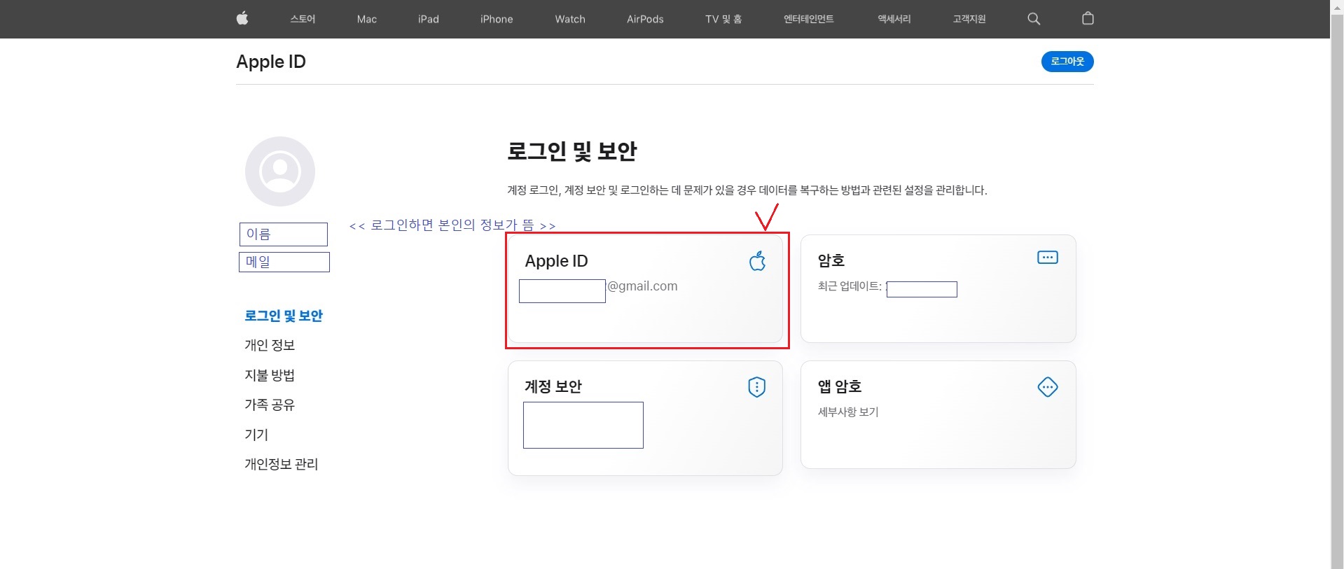 로그인 하면 본인의 이름과 메일 등 개인정보가 뜹니다.